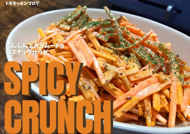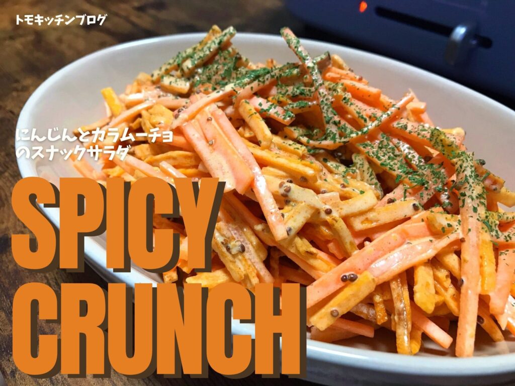 ピリ辛スナックのカラムーチョを使ったにんじんサラダレシピ。シャキシャキ食感とスパイシーな味わいがクセになる簡単おつまみ。仕事帰りの晩酌や家飲みにぴったりの居酒屋風スナックサラダです。