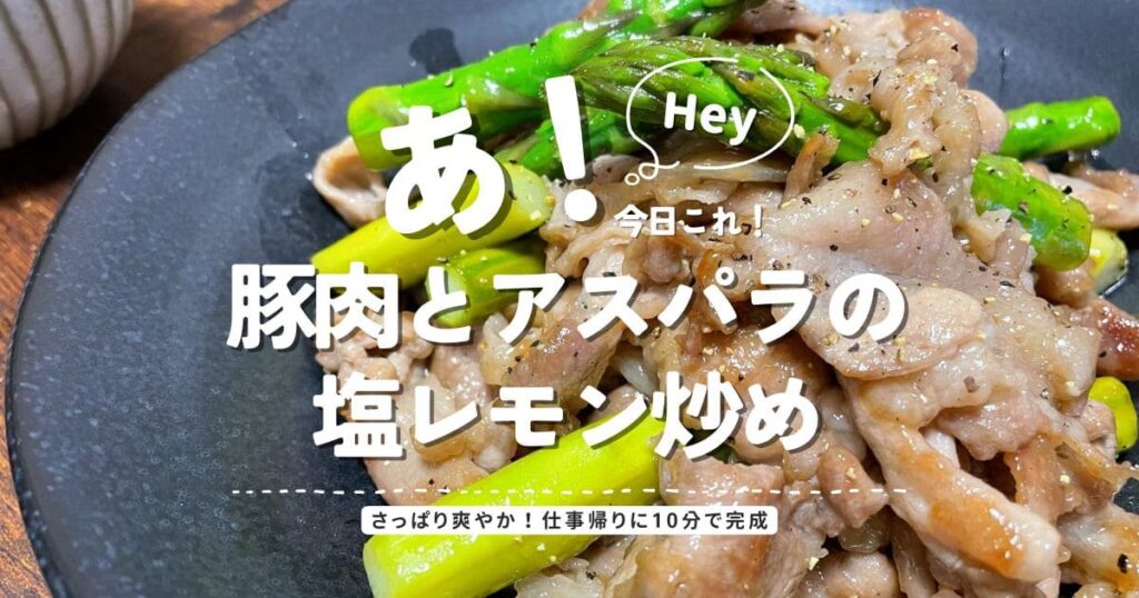 仕事帰りでもサッと作れる、豚肉とアスパラの塩レモン炒め。フライパンひとつ、下味なしで10分完成。さっぱり爽やかで平日の夕飯にぴったりな簡単レシピです。