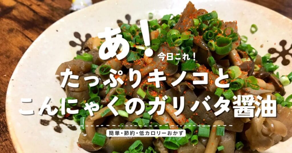 たっぷりキノコとこんにゃくを使ったガリバタ醤油おかず。切って炒めるだけで簡単、節約・低カロリーなのに満足感のある一品です。仕事帰りや作り置きにもおすすめ。